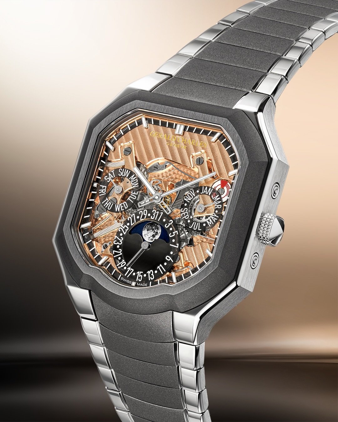 The watch’s aesthetic is deceptively simple. The titanium case offers lightweight comfort, the integrated bracelet ensures a sleek wrist presence, and the dial layout keeps the perpetual calendar information intuitively readable. Beyond style, the watch is a showcase of Gerald Charles’ in-house movement expertise: every wheel, lever, and spring is designed, assembled, and finished internally, making this not just a timepiece but a statement of horological independence.