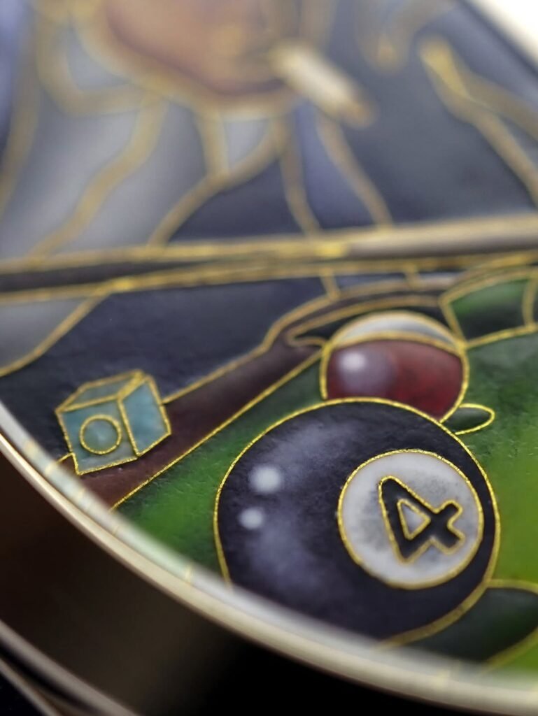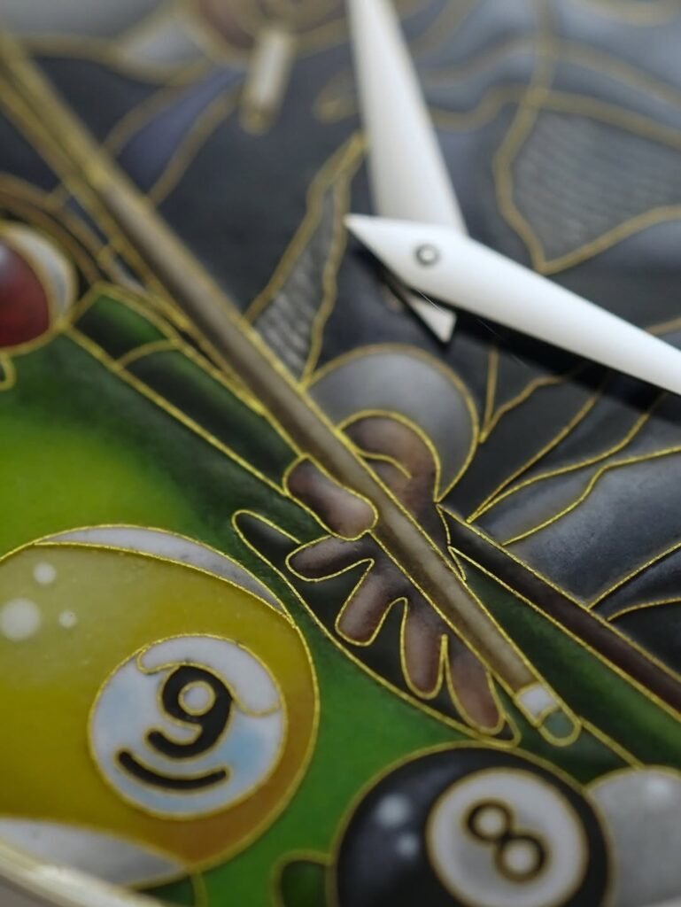 The billiards motif itself is remarkably detailed. The green felt table, the precisely positioned balls, and the subtle lighting effects are all rendered with careful brushwork, giving the dial a sense of depth rarely seen in watchmaking.