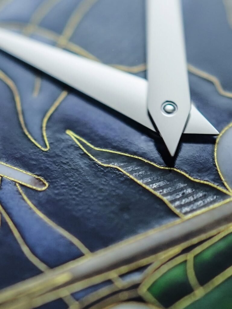 These crafts include grand feu enamel, miniature painting, engraving, wood marquetry, and cloisonné enamel—all techniques requiring years of training and an extraordinary level of precision. While many luxury watches rely on industrial dial production, these pieces are created almost entirely by hand.